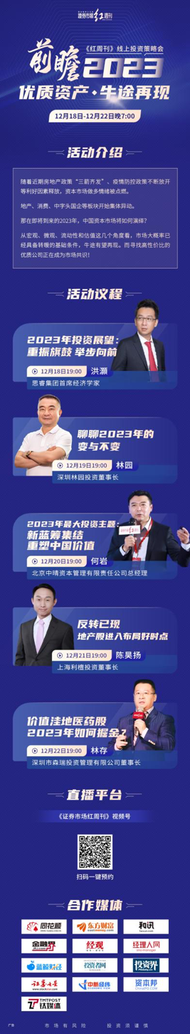 本次线上投资策略会将邀请林园、洪灏、何岩、林存、陈昊扬5位国内知名机构投资者,做客《红周刊》,与投资者共同前瞻2023年中国资本市场走向,寻找优质资产中的布局机会。