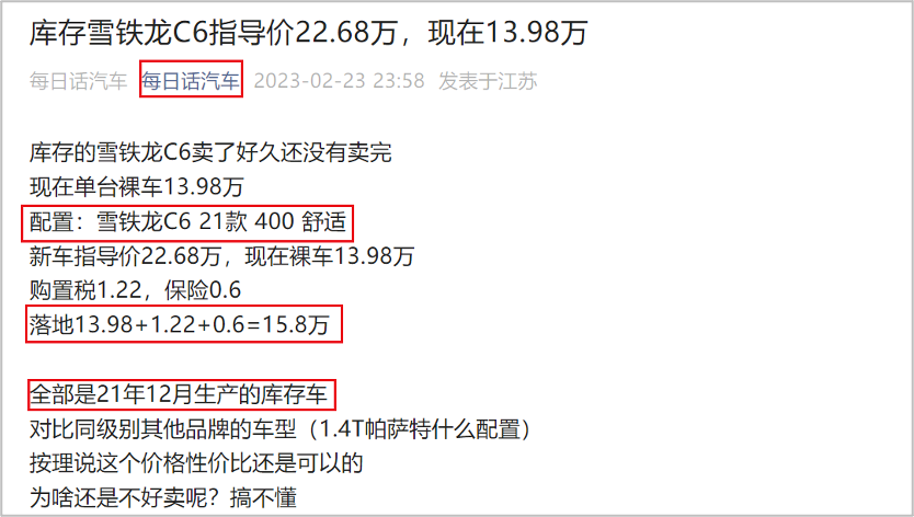 有网友爆料:**“最低配的共创办,也就是大家疯传的12万C6,其实只有300台,绝大部分都是更贵的舒适版,而且是21年的库存车。”**