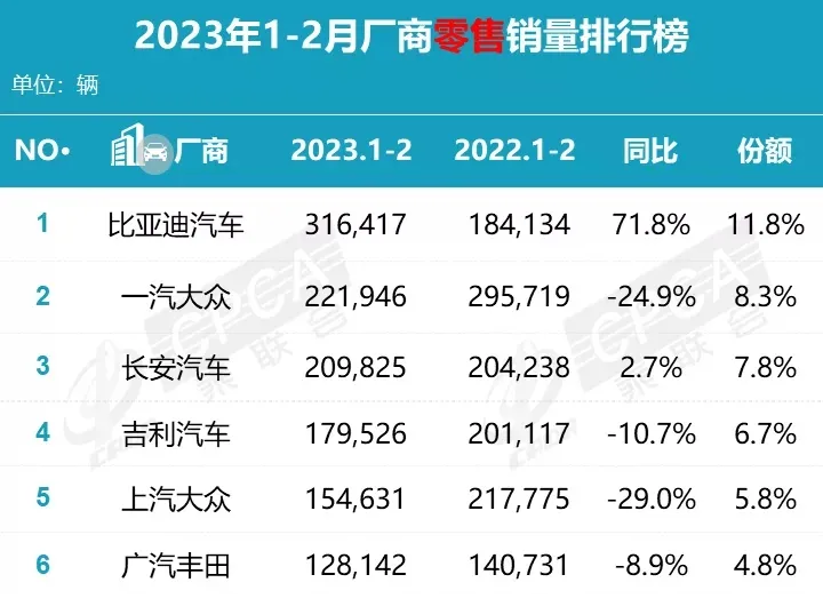 具体到部分车,比亚迪今年1-2月销量较去年同期增长13.2万辆车,而一汽大众下滑7.4万辆、上汽大众下滑6.3万辆。