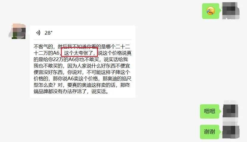 此外,针对“22万买奥迪A6”的传言,锌财经同样以消费者的身份联系到上海某奥迪4S店。该店销售表示:“这个太夸张了,给你22万的A6你也不敢买,给我我也不敢买,好东西不便宜、便宜没好东西,A6真卖这个价格,那奥迪其他车型怎么卖?奥迪这样卖的话,那终端品牌都没有办法存活了。”