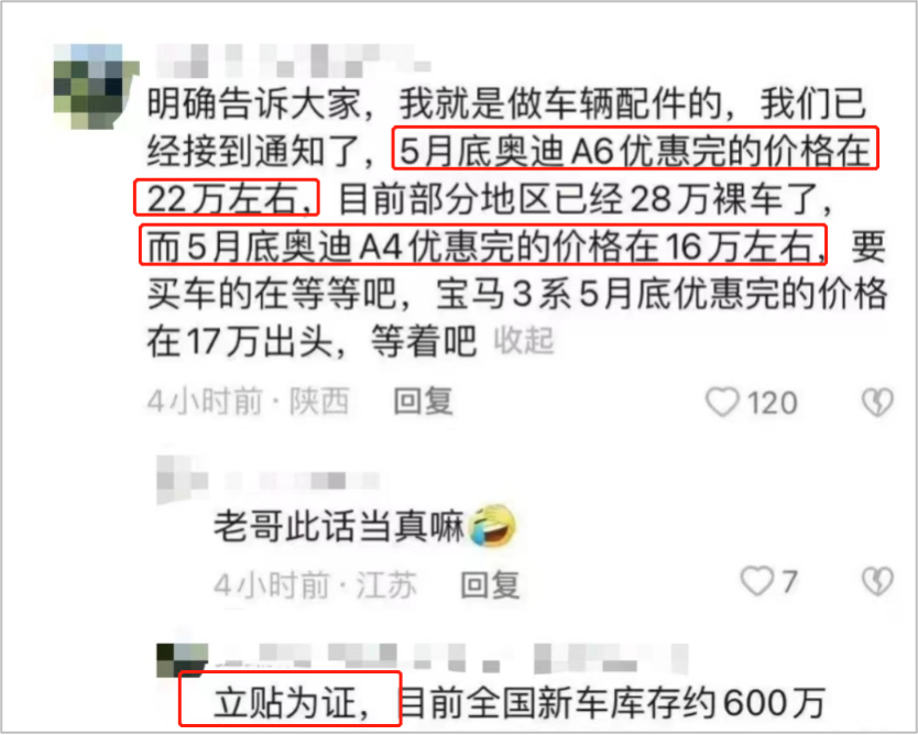 锌财经注意到,抖音平台上最近广泛流传一张截图,截图显示一位自称做汽车配件的用户在评论区表示5月底奥迪A6L优惠完价格在22万左右、A4L优惠完16万左右。