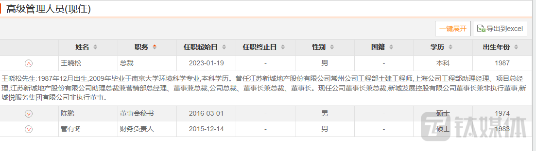 据悉,今年1月,新城控股公司董事兼总裁梁志诚刚刚辞职,目前公司的高管名单只有3人,其中包括董秘陈鹏以及财务负责人曹有冬,而王晓松则一人身兼董事长兼总裁,新城发展董事长兼非执行董事以及新城悦服非执行董事的职务。