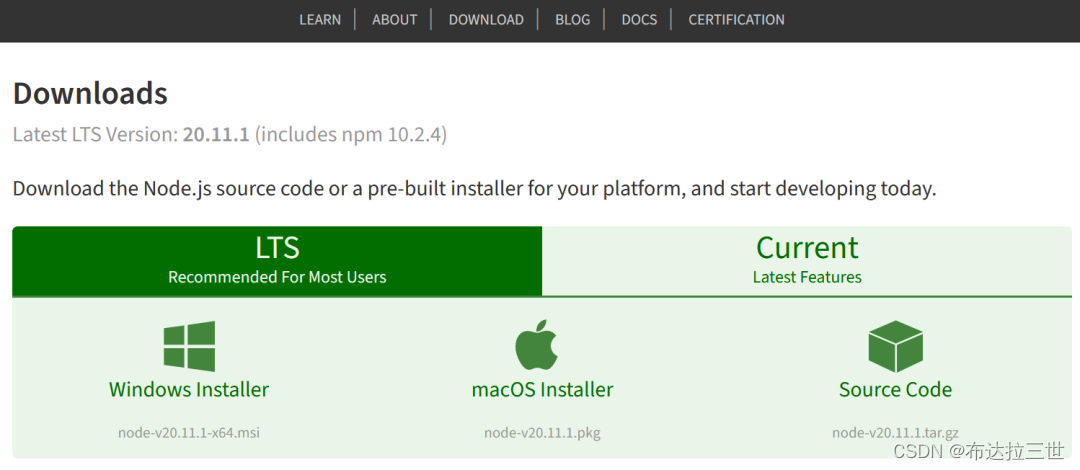 环境,一般推荐下载稳定版本 LTS(稳定版),按照提示下一步安装即可。