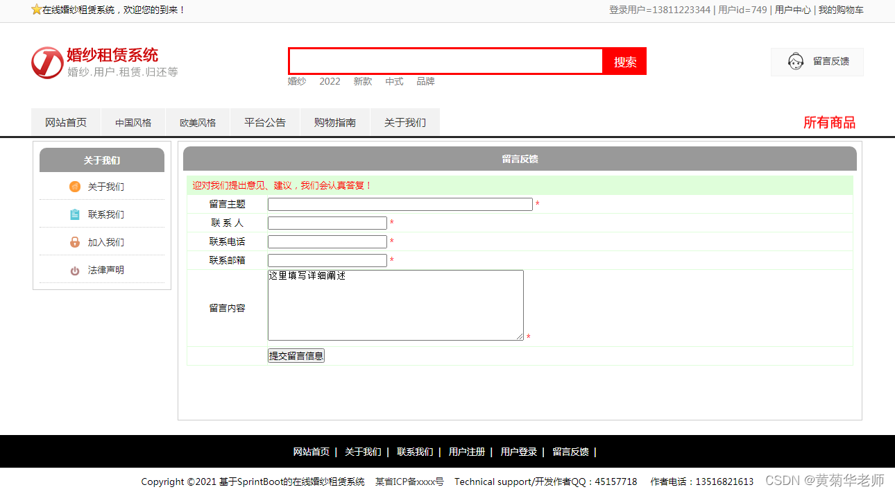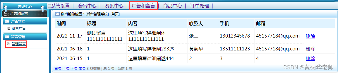 留言反馈:用户填写李哭咽的主题、联系人、电话、邮箱、留言内容;后台管理可以查看留言列表,可以删除留言。