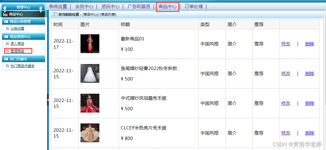管理婚纱商品:查看已录入所有婚纱商品,支持修改和删除