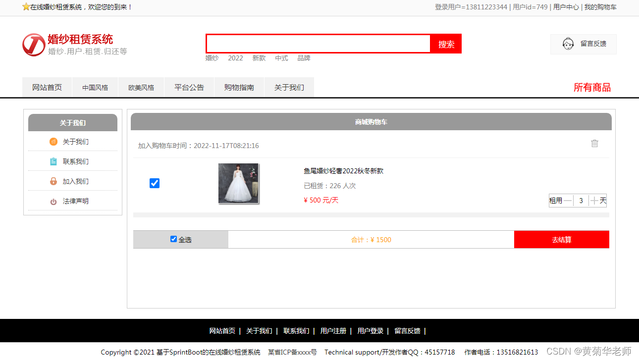 我的购物车:显示所有加入购物车打算租赁的婚纱列表。