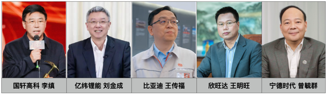 动力电池市场份额排名前十的企业中,来自比亚迪的王传福(1450亿元)、亿纬锂能的刘金成(605亿元)、欣旺达的王明旺(135亿元),以及国轩高科的李缜(95亿元)。