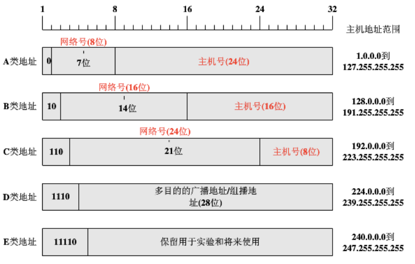 另外再简单介绍一下在没有子网掩码的时候是如何划分IP地址的,之前是把IP地址分成了A,B,C,D,E五类地址,这几类分别有几位是网络号,几位是主机号