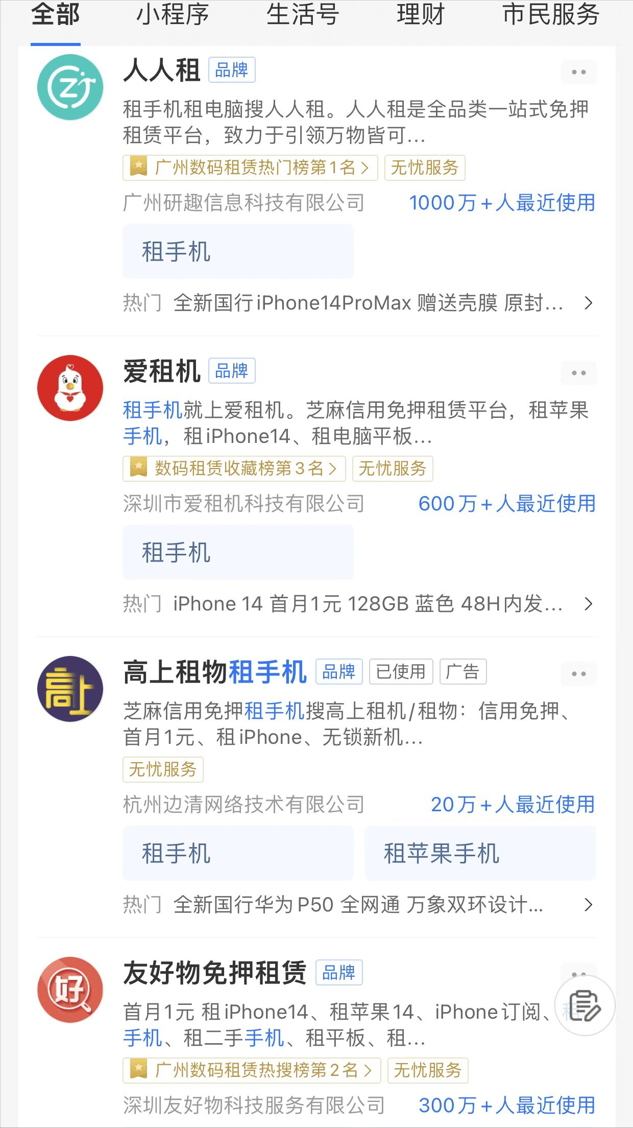 这种消费心理也推动了二手手机市场与租手机的行情。根据日前有媒体报道,目前租手机的门槛被降低,尝试租手机的用户在不断增加。日前,笔者搜素支付宝手机租赁相关的小程序中,人人租使用人数超过了1000万人,爱租机有600万人使用,友好物、迪瓜租机等都有超300万人使用。