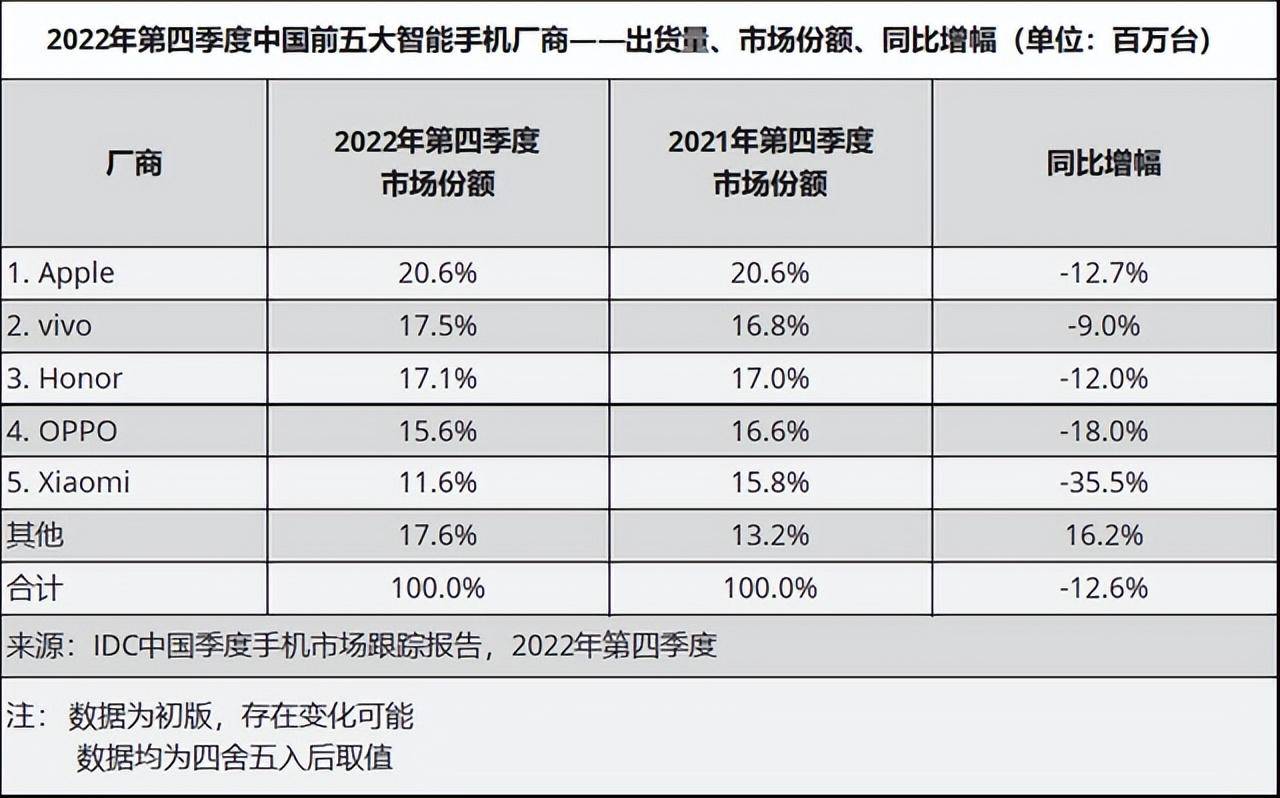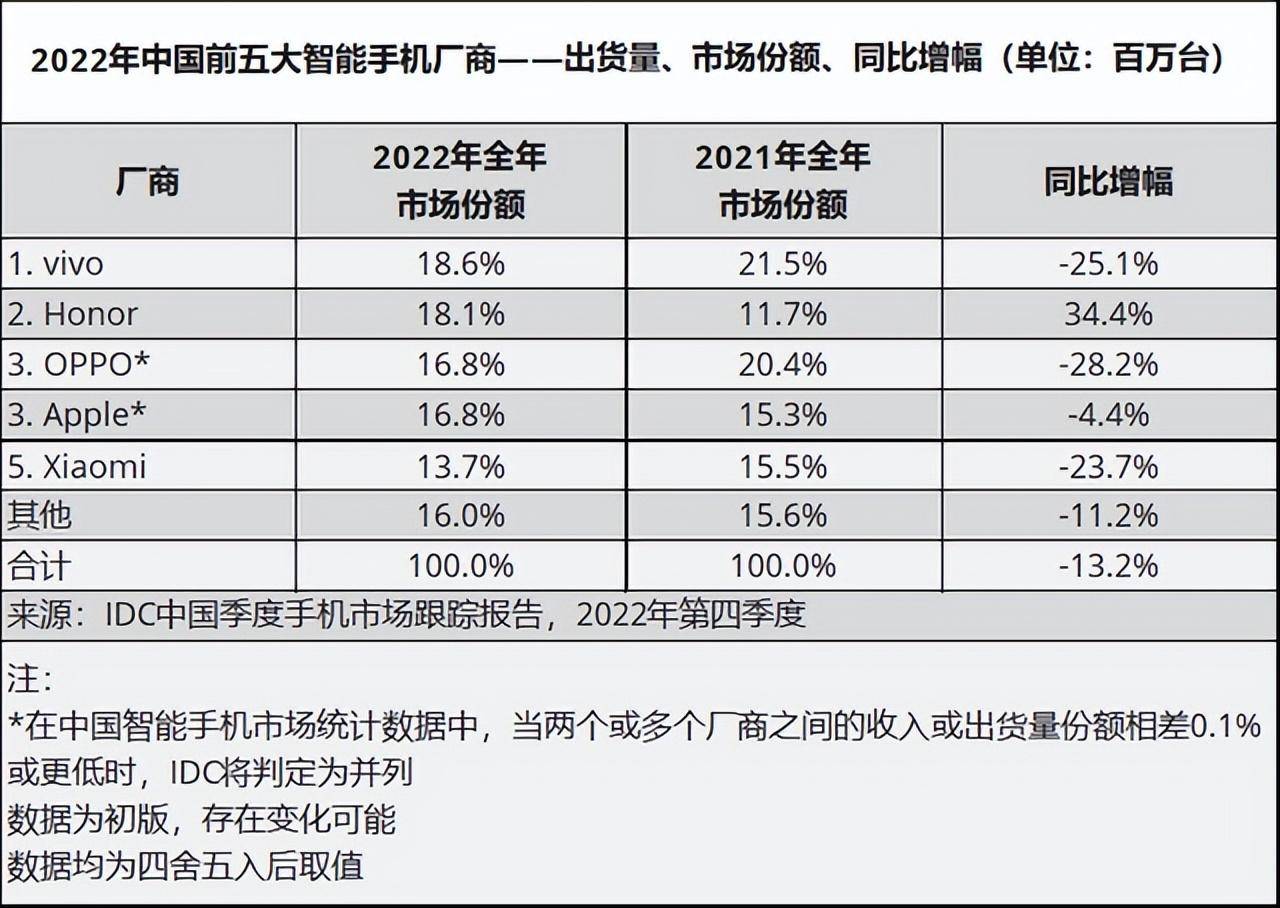 日前,据IDC中国发布的手机季度跟踪报告显示,2022年全年中国智能手机市场出货量约2.86亿台,同比下降13.2%,创有史以来最大降幅;从前五大厂商来看,除了荣耀之外,四家出货量都呈现出大幅度的同比下跌。vivo同比下跌25.1%,OPPO、苹果、小米分别同比下滑28.2%、4.4%、23.7%。中国前五大智能手机厂商分别为vivo、荣耀、OPPO、苹果、小米。