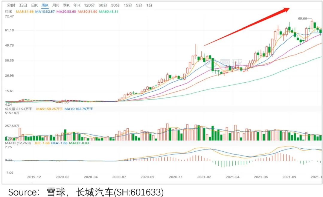 长城旗下的坦克300,推出后在终端门店引发了“坦克现象”,预订单20天内破万,就此炸醒了低迷已久的股价。