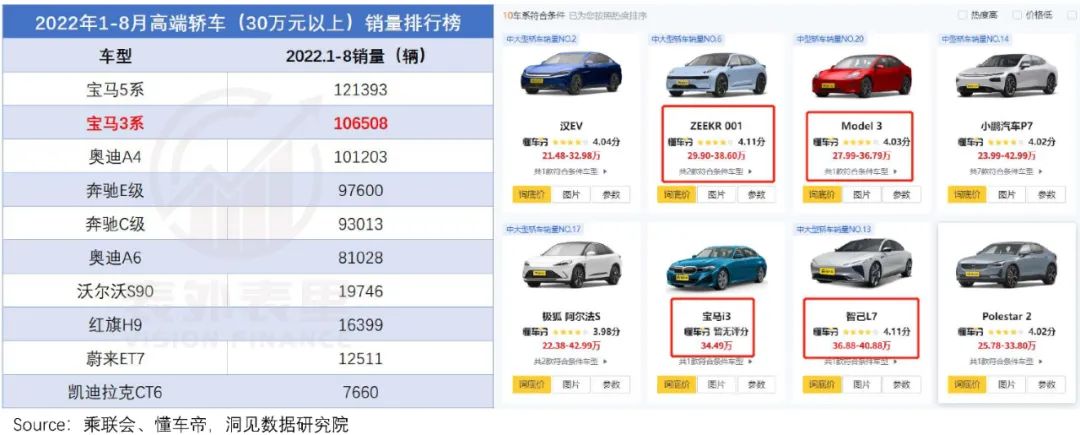 而具体到30万左右的新能源轿车市场,只有Model 3和ZEEKR 001表现较好,今年上市的宝马i3和智己L7,销量均未过2000辆。