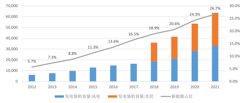 过去十余年,我国的能源转型取得了全球瞩目的成绩。根据国家能源局数据,截至2021年,我国风光累计装机容量占比达到26.7%,风光发电量占比11.7%。展望未来,新能源发电占比还将持续提升,直至成为主要电力来源,而传统火电慢慢退居二线,终极角色是作为调峰和补充产能。