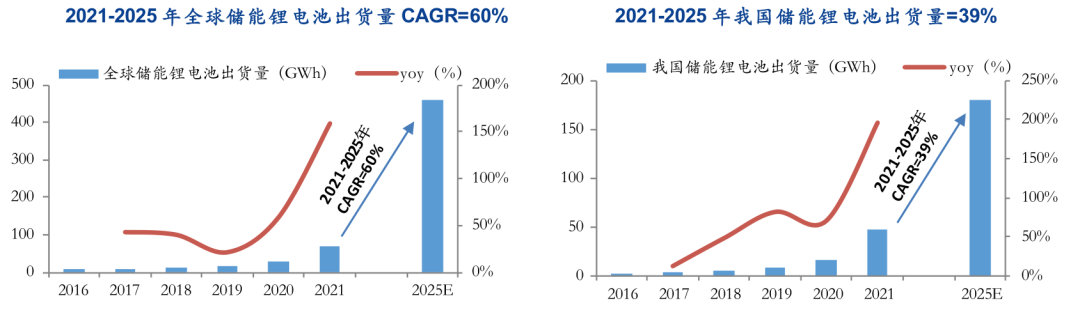 再看锂电池储能,根据高工锂电数据,预计2025年全球锂电池储能出货量达到460GWh,对应2021-2025年CAGR达到60%。其中,中国、美国和欧洲是锂电池储能主要市场。