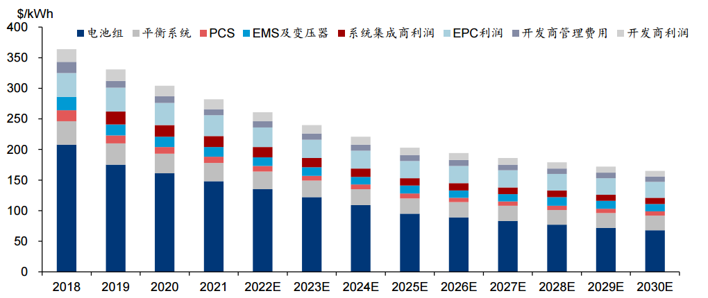 图6:电化学储能系统成本持续下降,资料来源:BNEF,华泰证券
