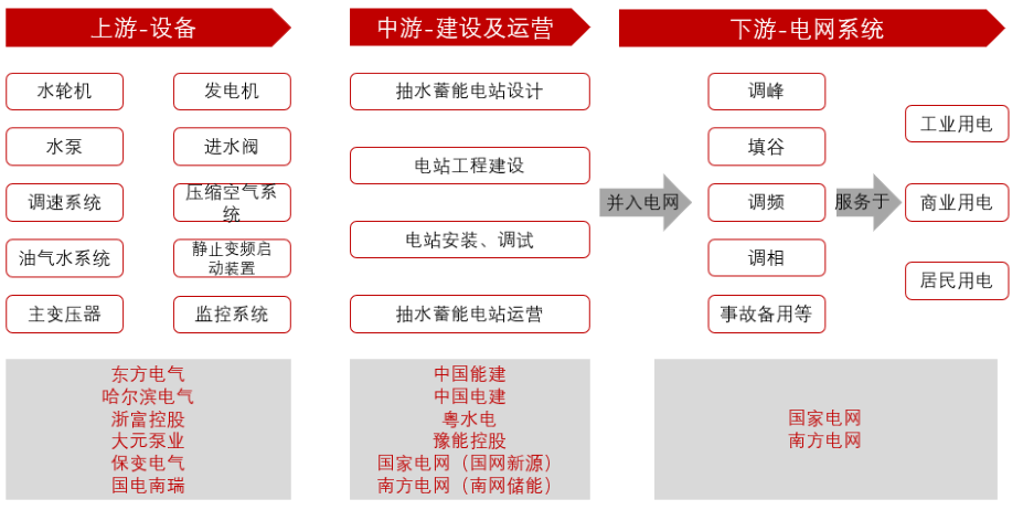 抽水蓄能产业链中游主要为电站设计建设及电站运营公司,电站设计、建设主要企业是中国电建和中国能建,电站运营主要包括国家电网和南方电网。