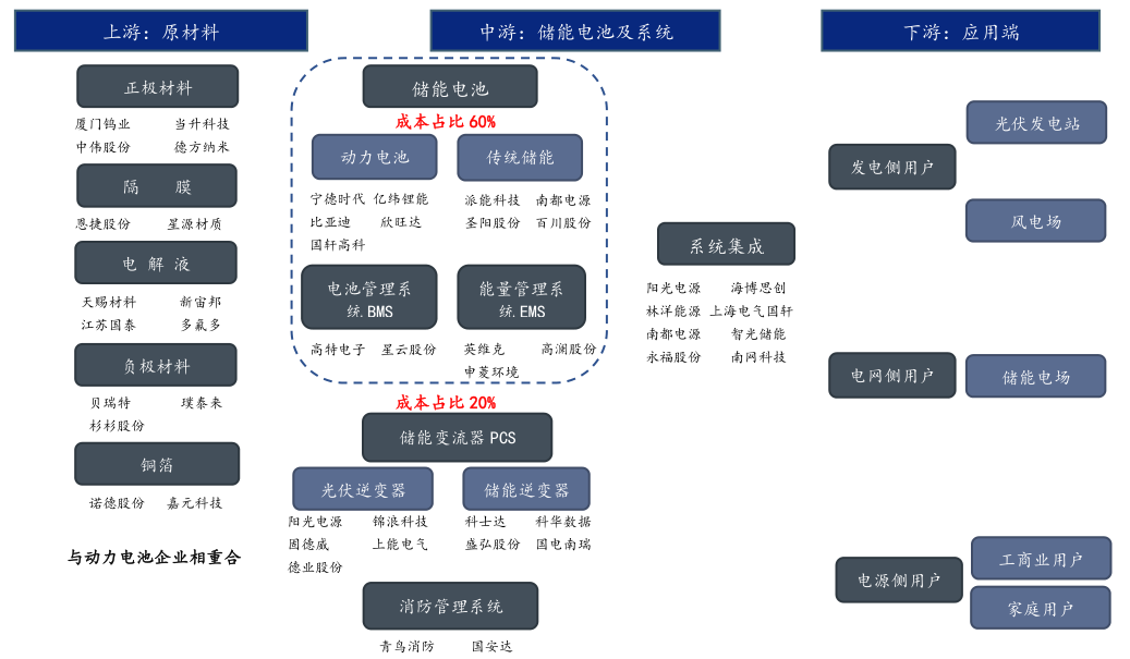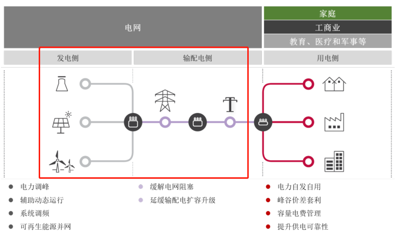 储能主要应用场景涵盖发电侧(风电场、光伏电站、传统电站等)、电网侧(电网公司等)与用电侧(家庭、工商业等)。而大型储能更多的应用于发电侧和电网侧。