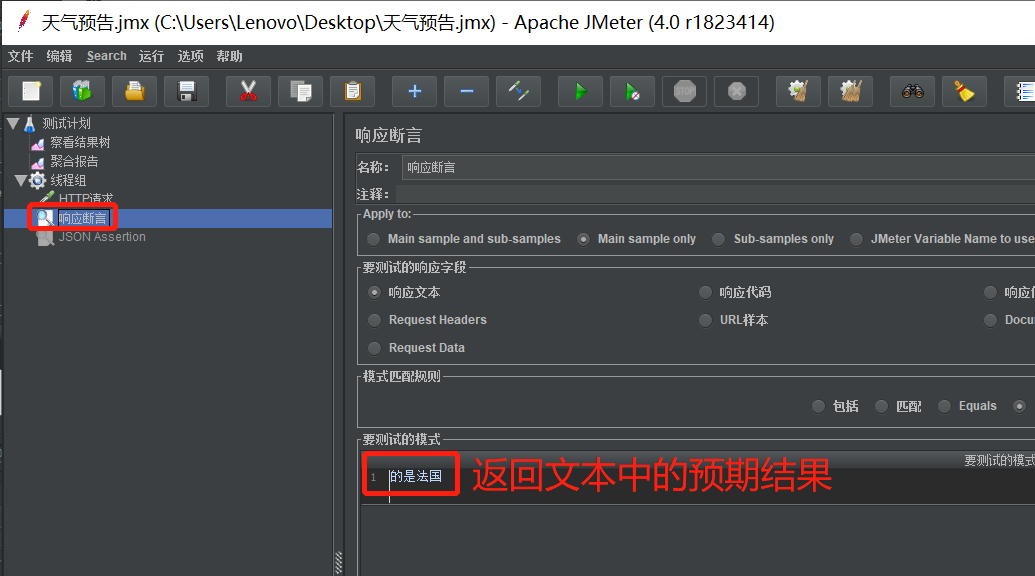 操作:在线程组>>添加>>断言>>响应断言