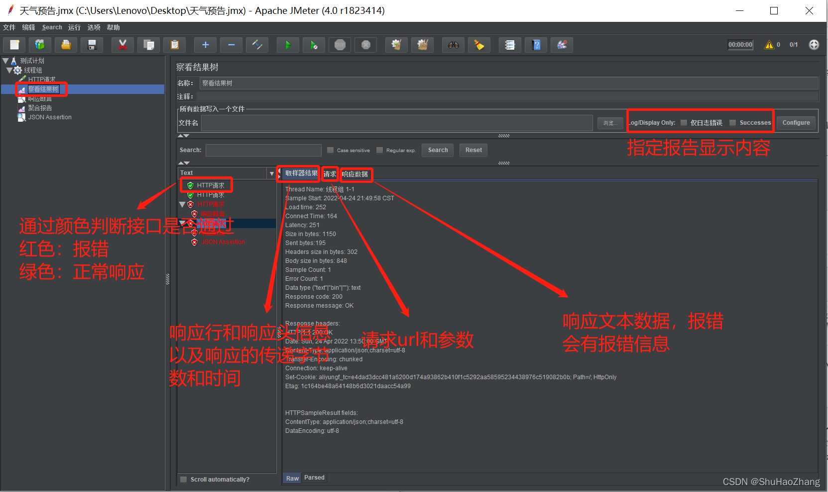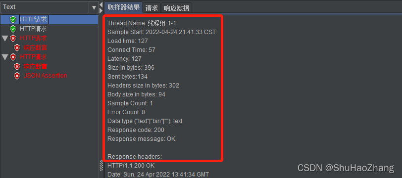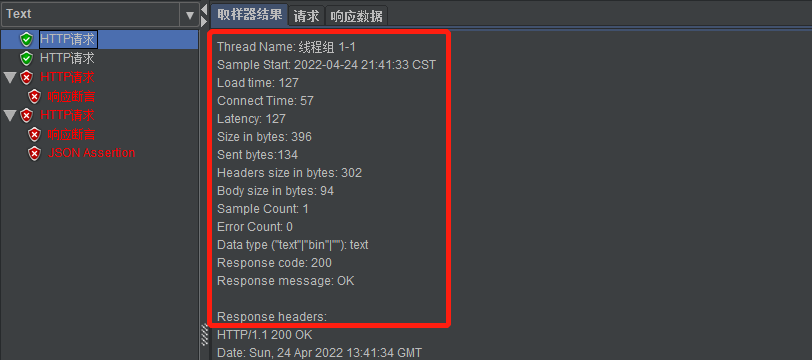 通过察看结果树,我们可以看到每个请求的结果,其中红色的是出错的请求,绿色的为通过 Thread Name:线程组名称