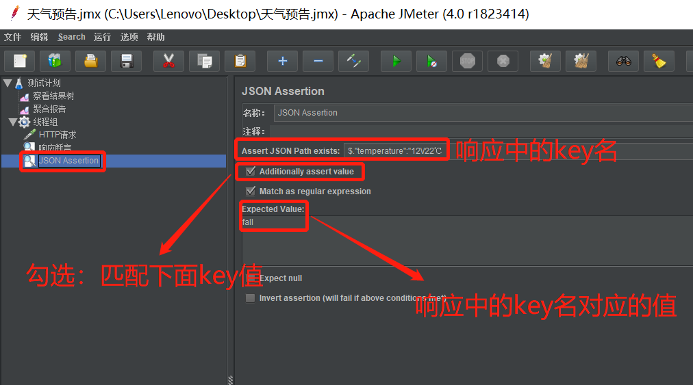操作:在线程组>>添加>>断言>>json断言