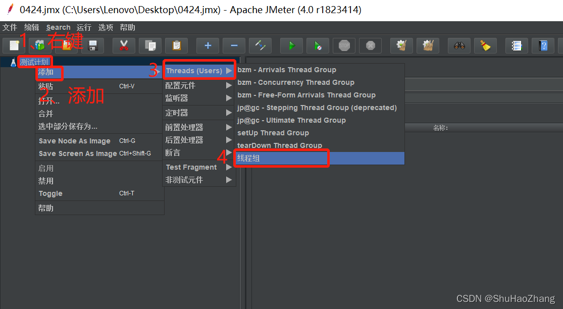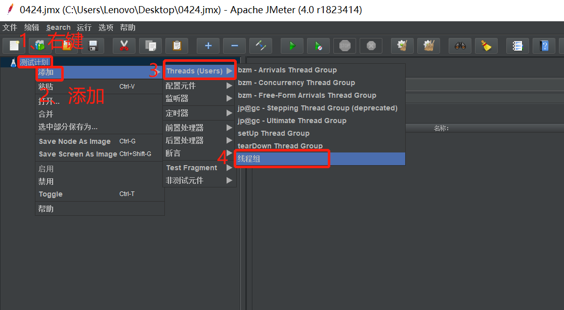 操作:在测试计划>>添加>>Threads>>线程组