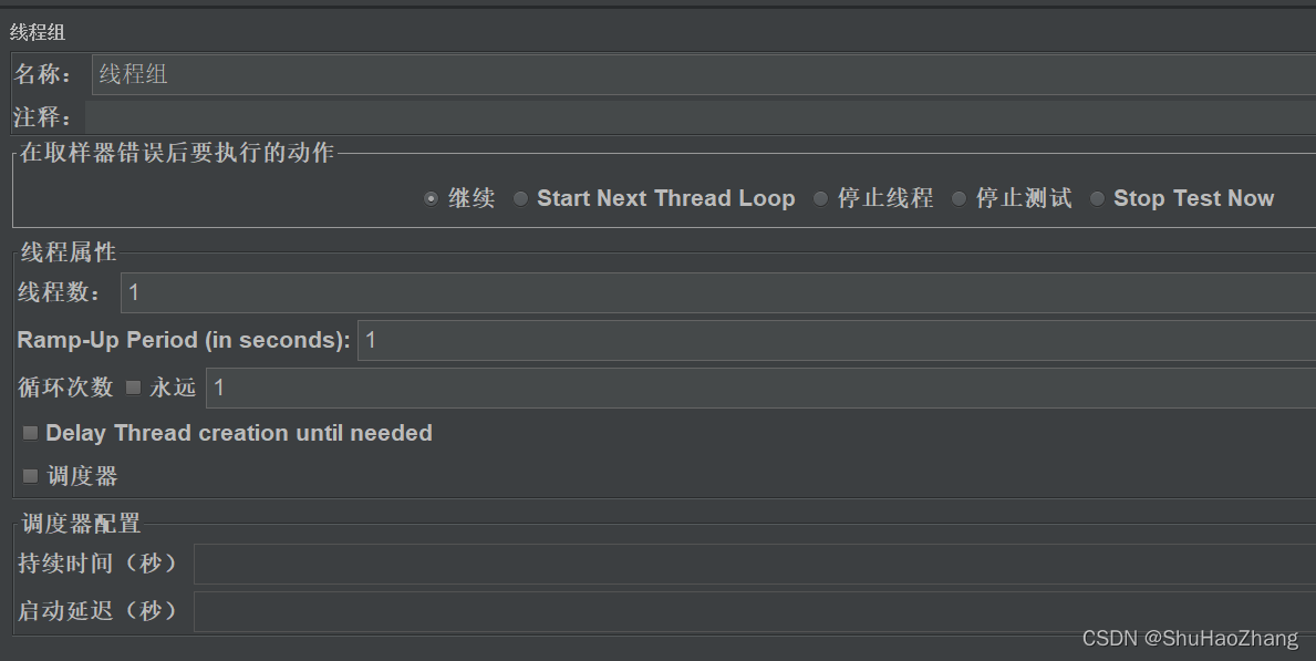 1、线程组主要包含三个参数:线程数、准备时长(Ramp-Up Period(in seconds))、循环次数。