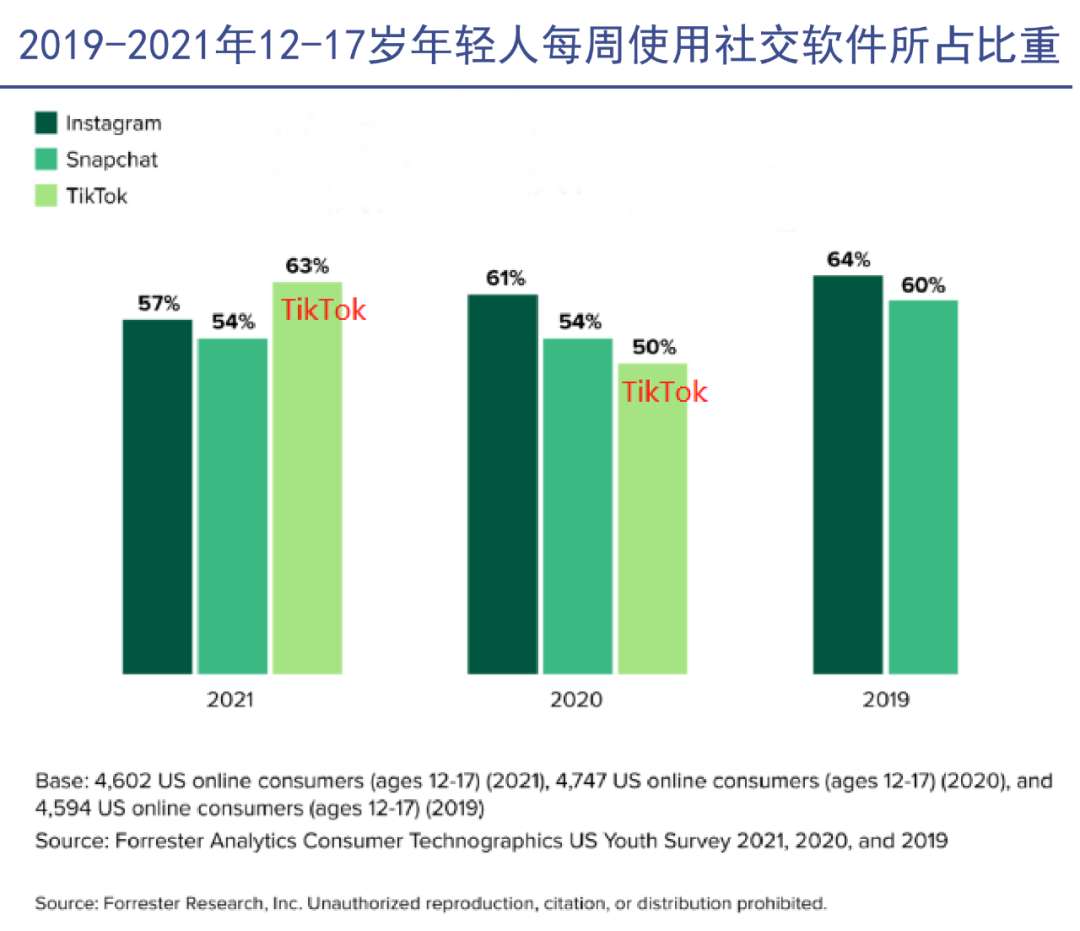 另一家研究公司Forrester research的报告显示,美国Z世代青少年每周使用TikTok的频率已增加至63%,正式超过Instagram,位居全美第一。在美国Z世代眼中,TikTok更有趣,娱乐性和自我表达功能,远超其他平台。