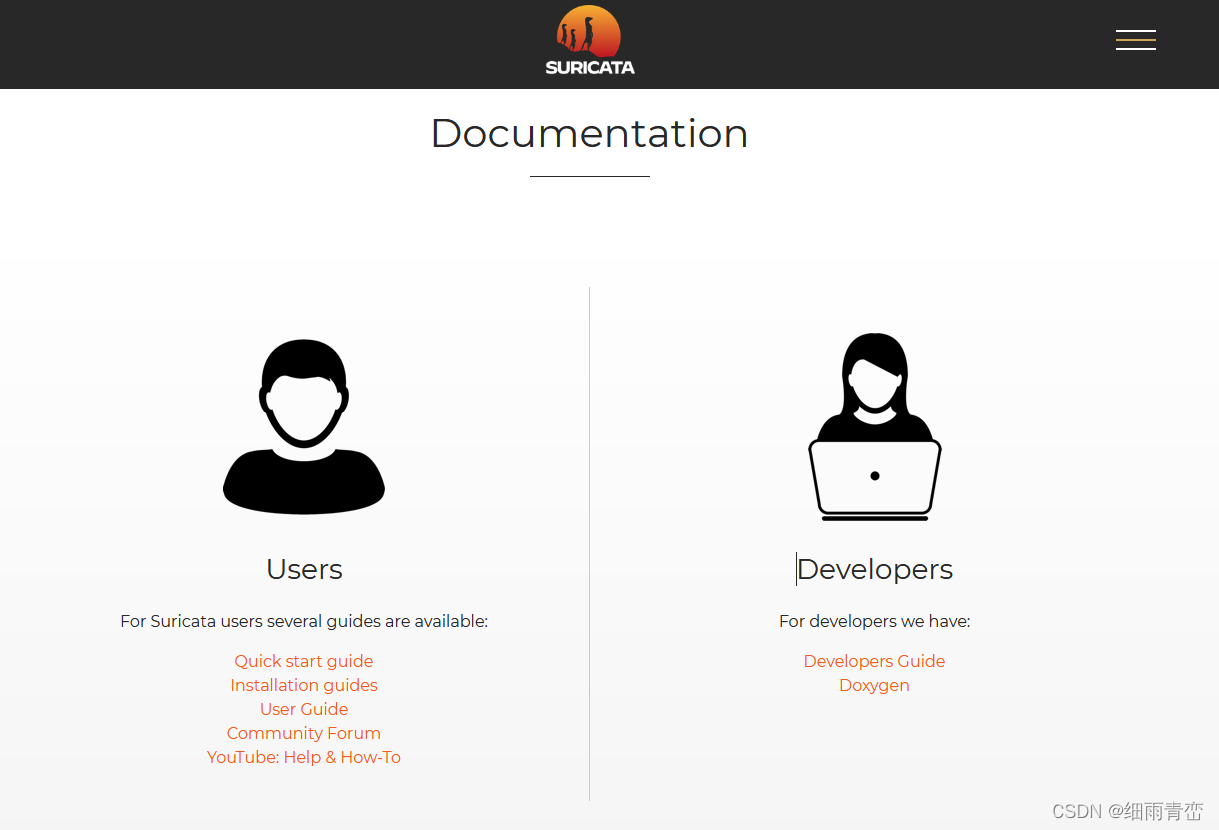 左面是**用户使用文档**,右面是**开发者文档**(更多的是开发用的)(咱们看左面就行)Suricata - Suricata - Open Information Security FoundationRedminehttps://redmine.openinfosecfoundation.org/projects/suricata/wiki/Suricata 这是维基百科上的文档,也在官网能找到