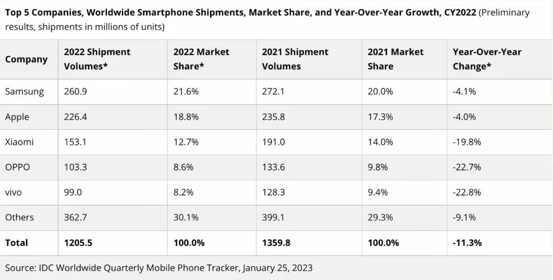 而具体到苹果公司,虽然苹果已是2022年智能手机大衰退中表现颇为优秀的厂商了,但iPhone在2022年的全球销量,依旧同比下滑4%至2.264亿部。