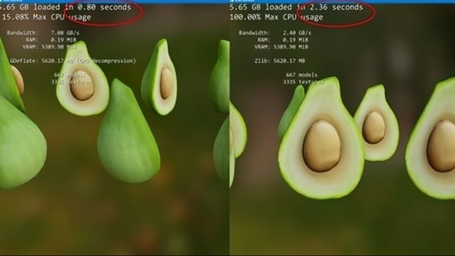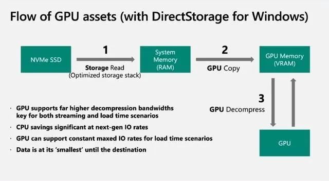 近日,微软更新了DirectStorage 1.1,这是一项原本应用于主机市场的技术,该技术可以让GPU的计算着色器直接访问固态硬盘,不需要再经过CPU的转译和处理,等于跳过了CPU的处理阶段,让GPU对游戏资源直接进行解压缩。