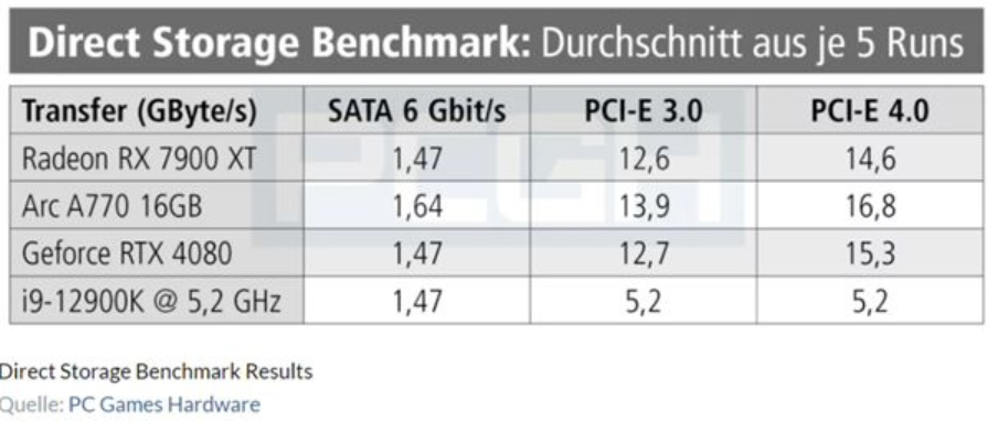 实际测试中,RX 7900XT、RTX 4080都在游戏资源解压缩上输给了Arc 770,即使是读写速度最低的SATA 6协议下(机械硬盘和SATA固态),Arc 770都有微小的领先。当传输协议更换为速度更快的PCIe 3.0和PCIe 4.0后,差距进一步拉大,均有超过10%的领先。