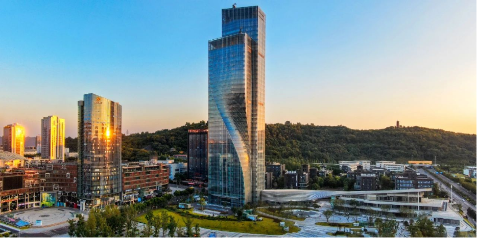夕阳穿过山城云层,洒在双曲幕墙立面上,如“极光”跳跃闪动。这座拥有独特双曲面的大楼,2022年最后一天交付给了腾讯,即将装修,打造全国唯一西南地区+工业互联网“双总部”省市。
