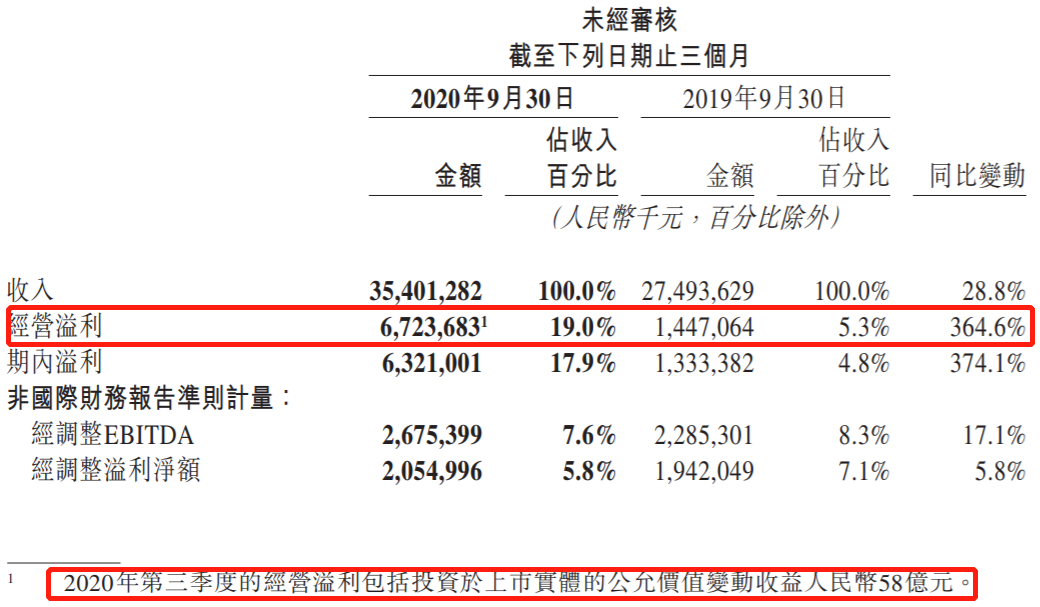 这笔投资直接使美团在这一季度的收益一飞冲天。美团2020年第三季度财报显示,美团营收354.01亿元,同比增长28.8%,经营溢利67.24亿元,同比大涨364.6%。其中,仅「投资于上市实体的公允价值变动收益」就有58亿元,比上年同期的1.64亿元翻了几十倍。