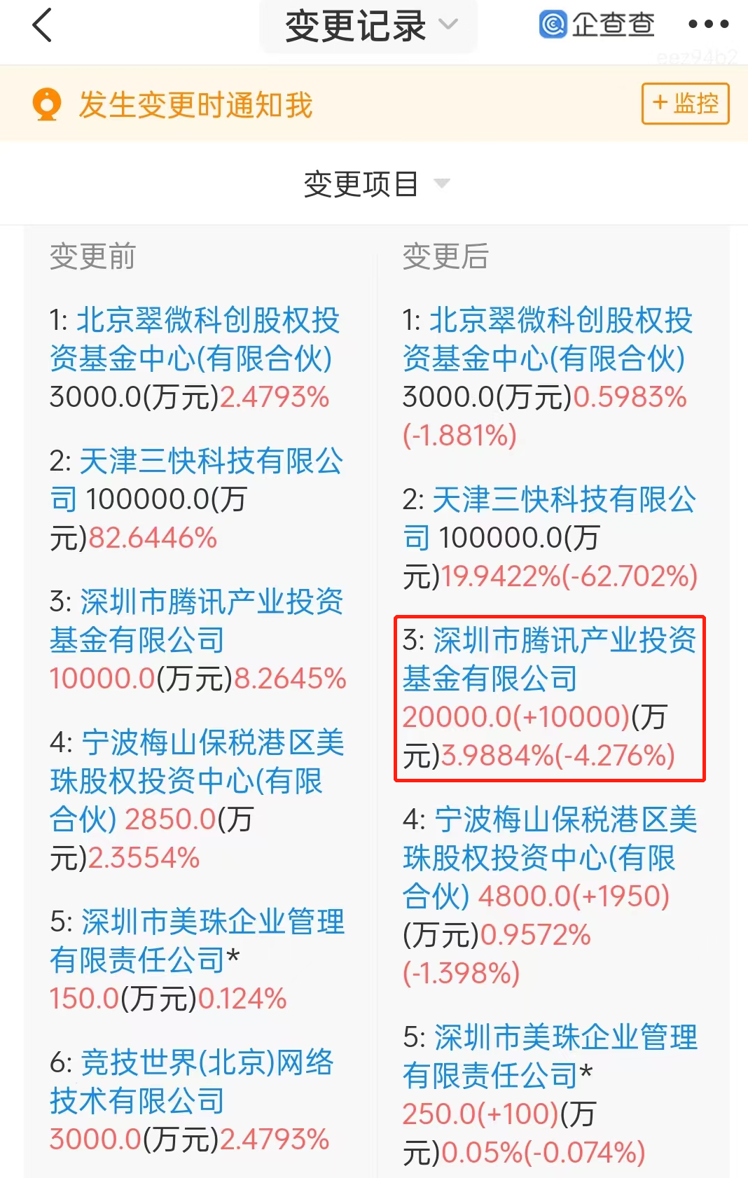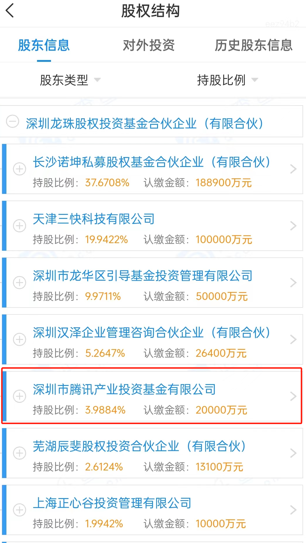 企查查显示,去年,腾讯的关联公司——深圳市腾讯产业投资基金有限公司(下称腾讯产业基金),又对深圳龙珠股权投资基金进行了增资,认缴金额为2亿元,持股比例为3.9884%。