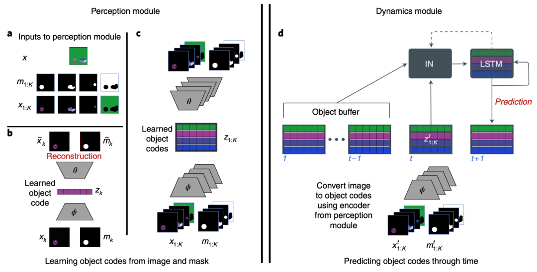 PLATO 将每一段视频帧通过感知模块分解为一组目标代码,实现了从视觉输入到个性化对象的映射;随后,目标代码在对象缓冲区中通过帧进行累积和跟踪;最后,系统会动态地处理物体的表征,产生新的表征,这些表征会受到物体与其他物体之间的关系和互动的影响。