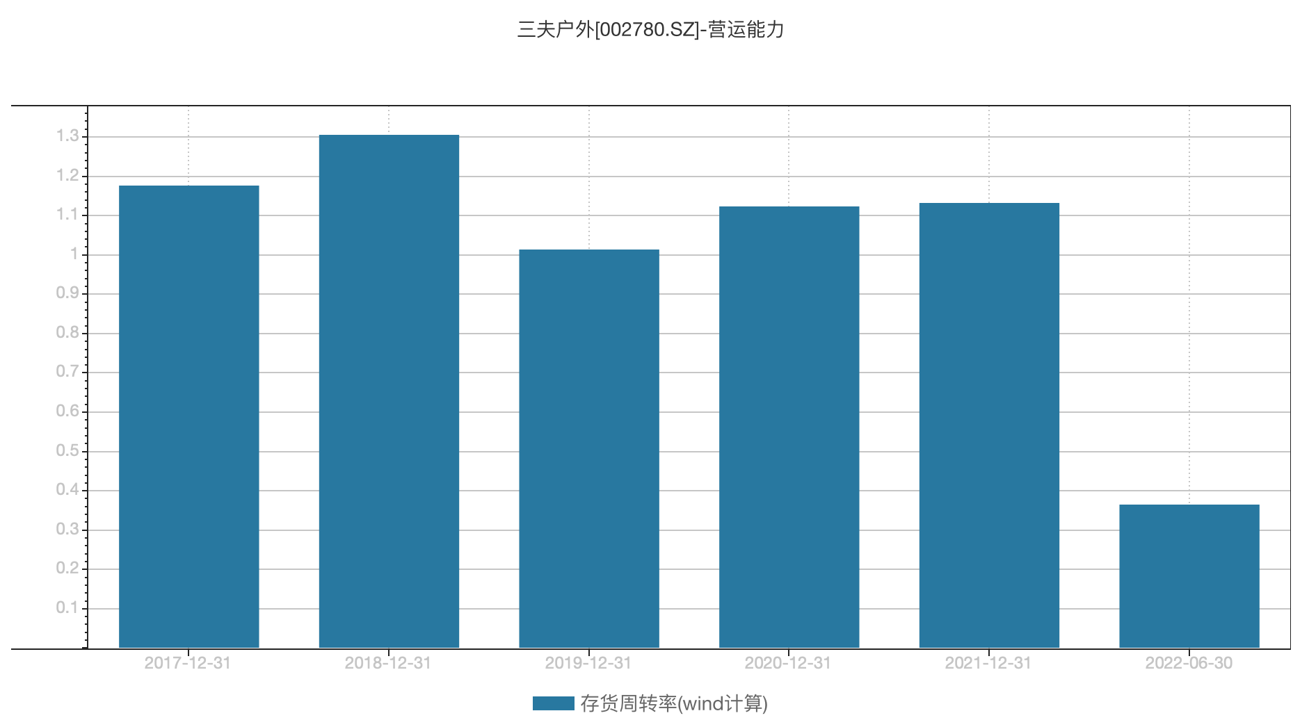 值得注意的是,近几年三夫户外存货较高,且存货周转率呈下滑趋势。截至6月30日,公司存货为2.90亿元,甚至超过了上半年的营收2.37亿元。同时其存货周转率仅为0.36次,远低于同行“牧高笛”的1.18次和“探路者”的0.98次,说明公司出现库存积压情况并且产品竞争力相对不强。如果未来市场增长慢下来,存货无疑是一颗雷。