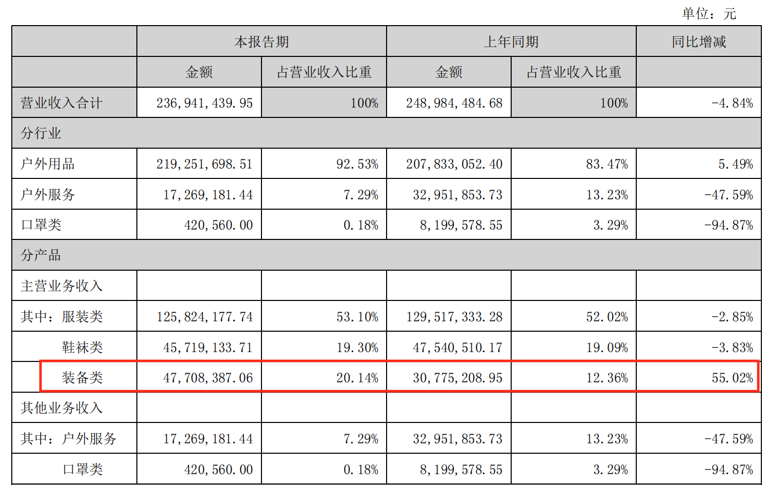 露营兴起带动的主要是户外装备类消费,如帐篷、天幕、睡袋吊床、野餐用品等,对户外服装则没有太大拉动作用。而在三夫户外的产品结构中,服装鞋袜显然是核心,合计占比72.4%,户外装备占比仅20%。不过,尽管上半年服装鞋袜收入都在下滑,户外装备类收入却同比大幅增长55%至4770.84万元。可见,露营装备销售量的显著提升,部分对冲了疫情对零售业务带来的不利影响,使其户外用品收入同比增长了5.49%。