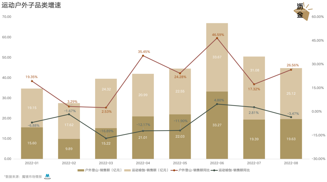从二级类目看,运动户外品类的增长,主要由户外登山、露营的热度提升带来,销售额同比增幅最高达46%。