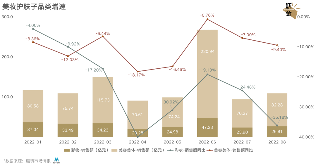 而美妆护肤遇冷,主要受彩妆的销售额持续大幅下滑影响,8月彩妆的销售额同比下滑36.2%。