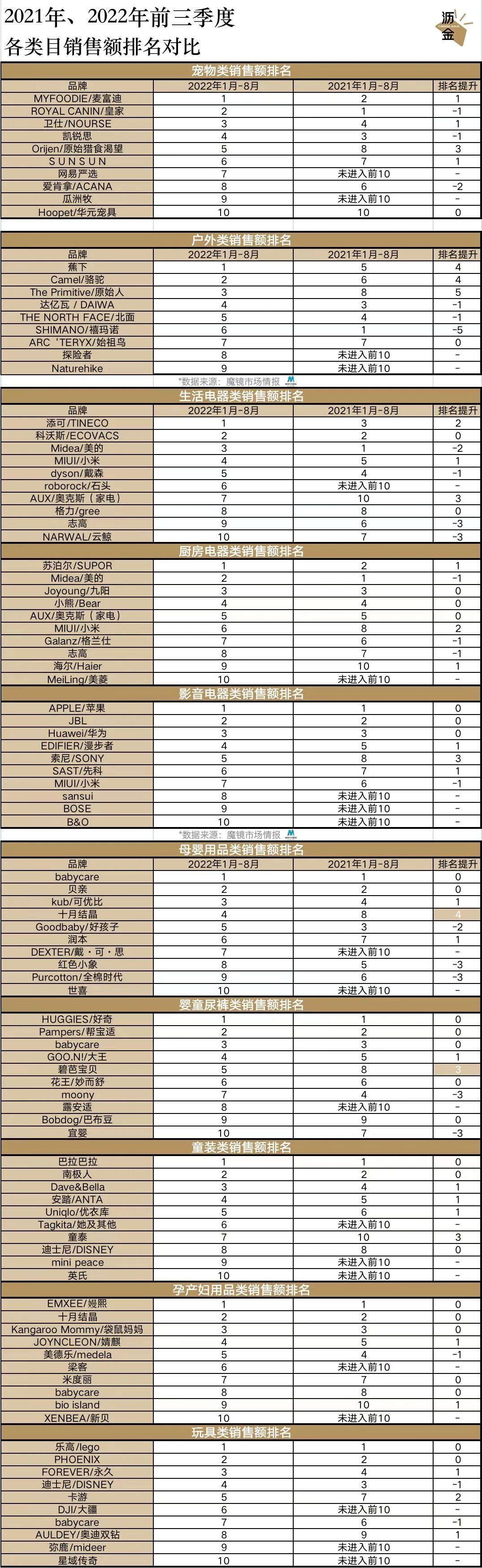 2021、2022年前三季度分类目销售额排名(向下滑动)