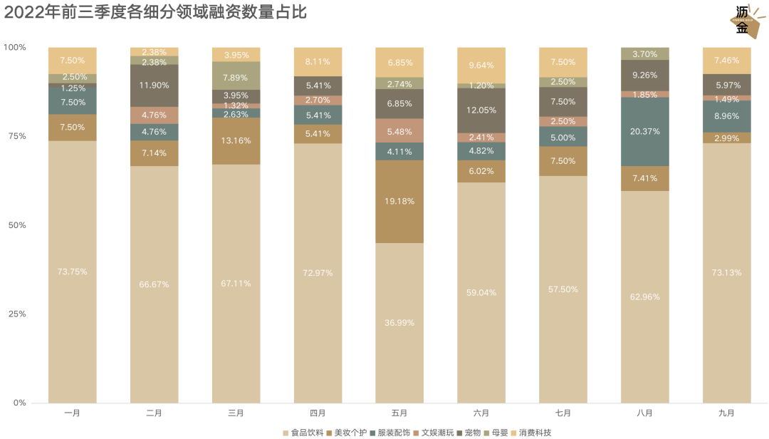 从消费类目来看,食品饮料领域一直占据消费投资的最大比重,达到6-7成。