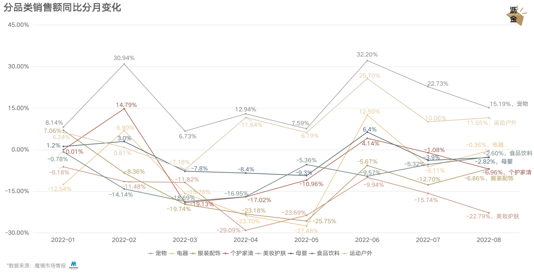 消费的具体类目表现也不尽相同,波动振幅甚至出现两极分化。沥金摘取了宠物、电器、服装配饰、个护家清、美妆护肤、母婴、食品饮料、运动户外这八个主流消费领域进行研究。