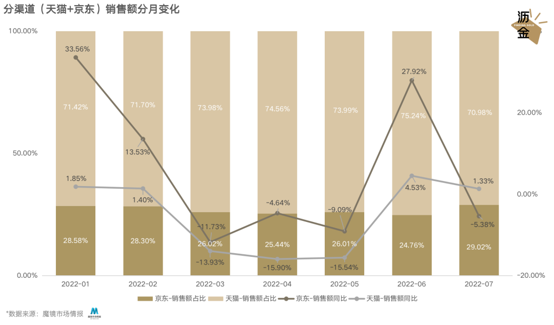分渠道看,京东的回暖速度快于天猫(京东分月销售额同比高于天猫),7月京东销售额占比环比提升4.3pp。这可能因为京东体量较小,波动较大,但也反映出京东对市场动态更为灵敏。