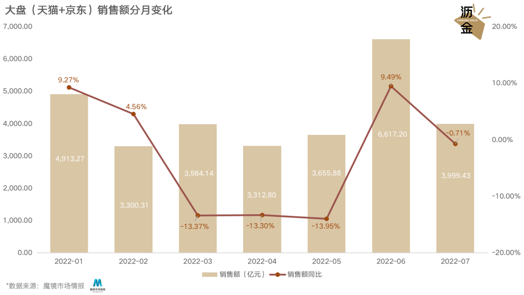 综合天猫与京东两大平台数据,排除2月的常规春节假期停摆,今年4、5月份的销售额降至最低点,为消费市场的“至暗时刻”。