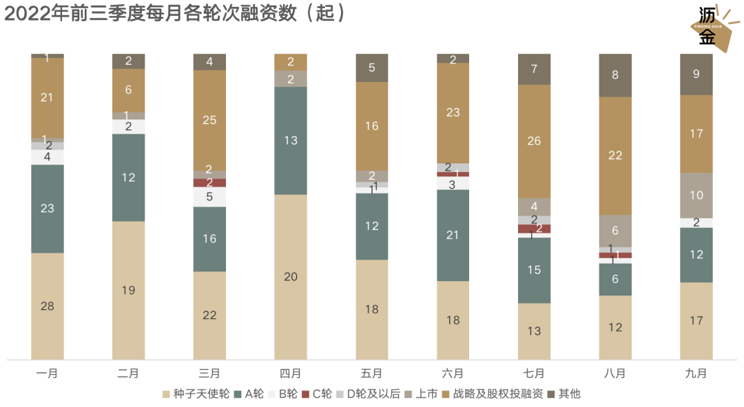 从融资轮次数来看,天使轮的比重明显下降,尤其在4月后呈显著下滑趋势,这意味着机构愈发谨慎,减少对于早期项目的投入和布局。