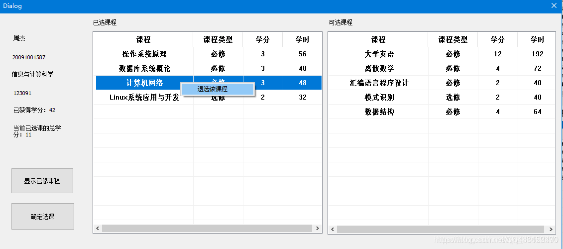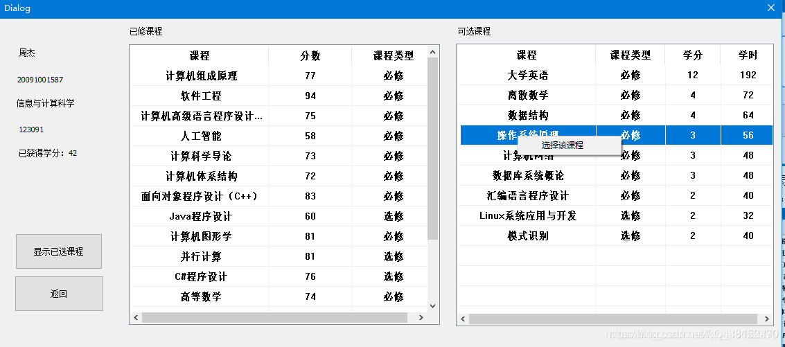 (3)能够看到自己的可选课程信息表格(包括课程,课程类型,学分和学时)。并且能够右键表格中的课程进行选课操作。