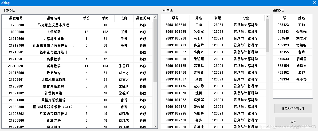 (4)能够将前面修改的内容保存到新的文件中(该保存包括了教师对学生的成绩修改和学生的选课改动)。