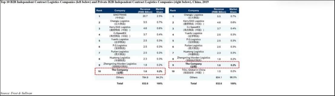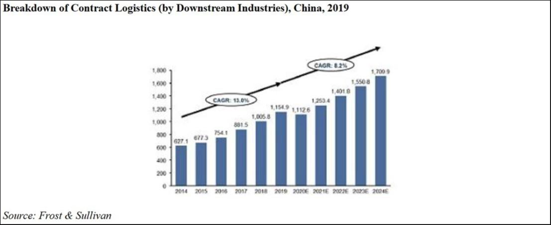根据Frost & Sullivan数据,中国的合同物流产业在最近几年获得长足发展,从2014年约6271亿元人民币增长至2019年达1.15万亿元人民币,年复合增速为13%。同时,由于仓储和供应链管理的升级,预计中国的合同物流产业将继续扩大。预计到2024年将达到1.71万亿元人民币,2019-2024年复合增速为8.2%。