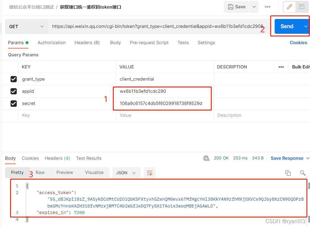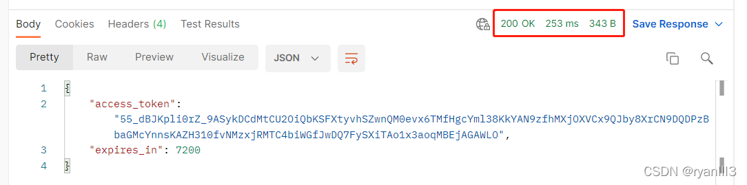 3. 查看返回结果,成功获得access_token,符合API文档中的返回结果描述。