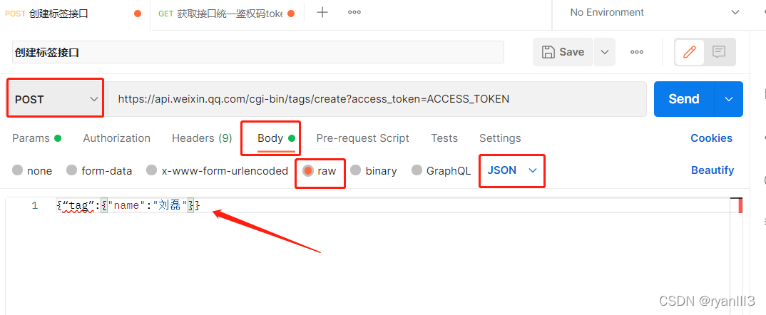 然后点击Body标签,如下图填入上传参数。{“tag”:{"name":"刘磊"}}
